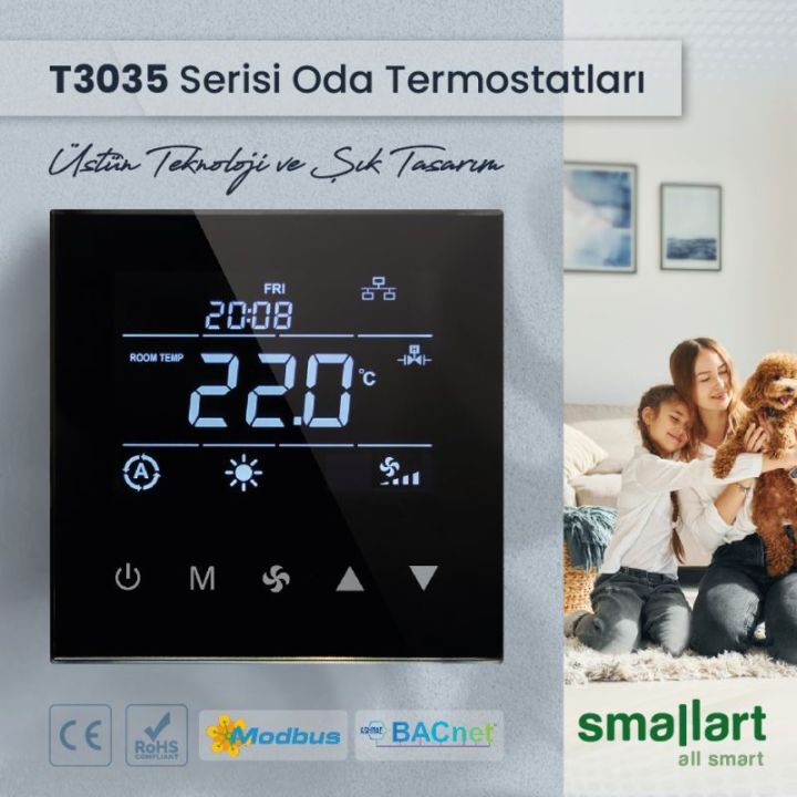 Smallart marka oda termostatlarıyla fancoil, yer konvektörü, ısı pompası, kombi gibi cihazları çalıştırırken bina otomasyon sistemlerine entegre edip yönetmenize olanak sunuyoruz. Bu tür cihazların bulunduğu 2-4 borulu ısıtma soğutma sistemleede var olan tüm ürün grupları ile ilgili tedarik konusunda bize ulaşabilirsiniz.